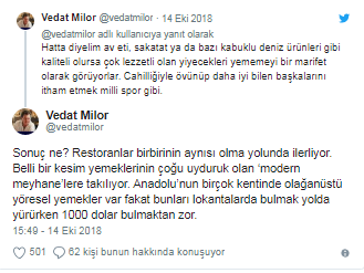 Milor Twitter’dan da, ” Anadolu’nun birçok kentinde olağanüstü yöresel yemekler var fakat bunları lokantalarda bulmak yolda yürürken 1000 dolar bulmaktan zor” dedi.