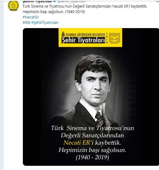 Türk Sinema ve Tiyatrosu’nun değerli sanatçılarından Necati Er’i kaybettik. Hepimizin başı sağ olsun. (1940-2019)