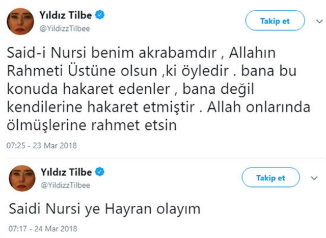 Said-i Nursi’nin ölümünün yıldönümü olan 23 Mart’ta “Said-i Nursi benim akrabamdır, Allah’ın Rahmeti üstüne olsun, ki öyledir. Bana bu konuda hakaret edenler, bana değil kendilerine hakaret etmiştir. Allah onların da ölmüşlerine rahmet etsin” tweeti atan Tilbe’ye takipçilerinden farklı tepkiler geldi.