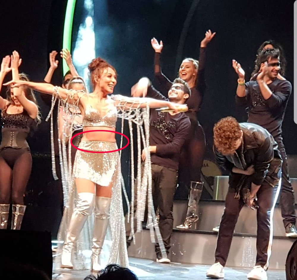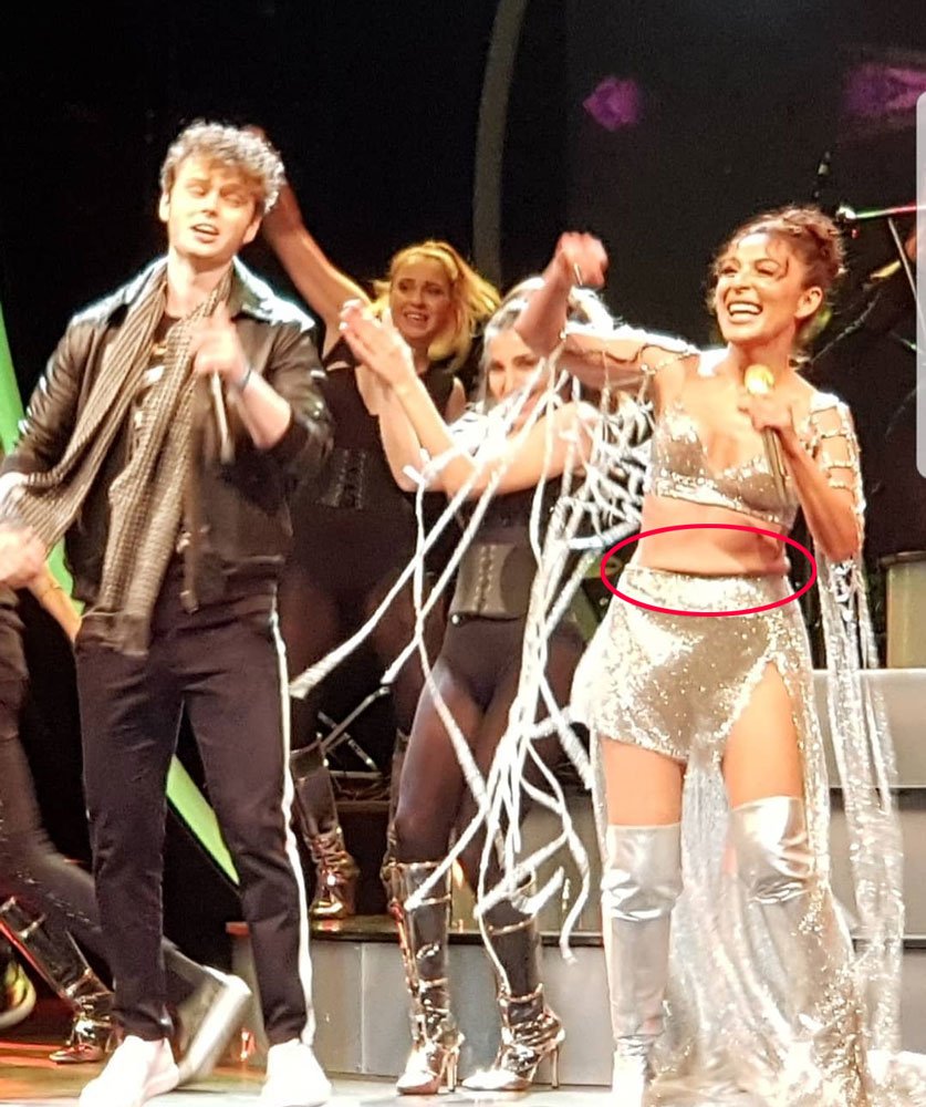 Sali, konserin bir kısmında ise ışıltılı metal renginde, 3 parçadan oluşan bir tasarımla çıktı sahneye. Düşük bel, bacak yırtmaçlı etek, bralet ve püsküllü bir yelek giyen Sali’nin eteğin kenarlarından taşan yağları ise sosyal medyanın diline düştü.