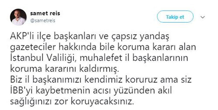 İYİ Parti Genel İdare Kurulu Üyesi Samet Reis de karar sonrasında sosyal medyadan yaptığı açıklamada “AKP’li ilçe başkanları ve çapsız yandaş gazeteciler hakkında bile koruma kararı alan İstanbul Valiliği, muhalefet il başkanlarının koruma kararını kaldırmış. Biz il başkanımızı kendimiz koruruz ama siz İBB’yi kaybetmenin acısı yüzünden akıl sağlığınızı zor koruyacaksınız” dedi.