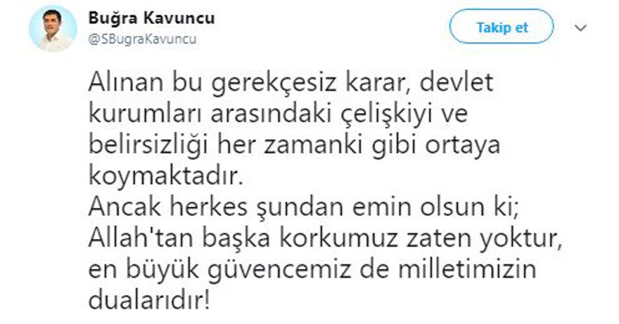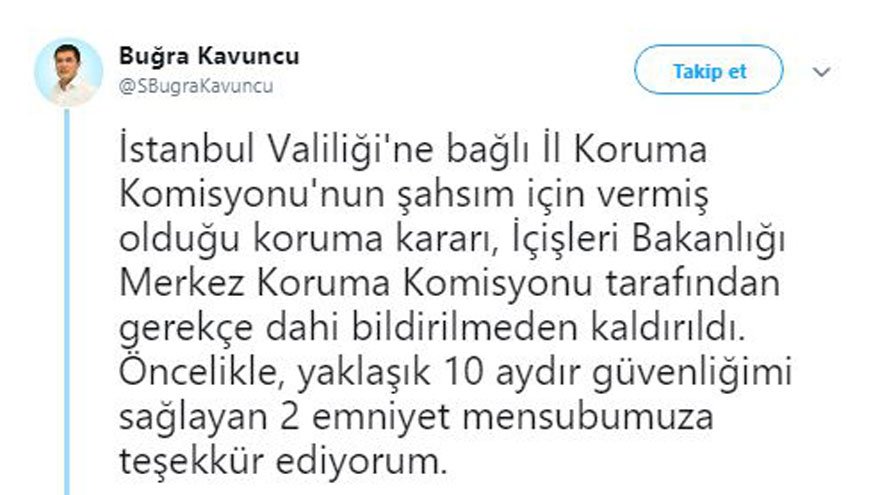 CHP İstanbul İl Başkanı Canan Kaftancıoğlu’nun koruma kararının kaldırılmasının ardından, İYİ Parti İstanbul İl Başkanı Buğra Kavuncu’nun da koruma polisleri çekildi. Kavuncu, akşam saatlerinde konuya ilişkin sosyal medyadan açıklamada bulundu.