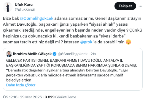 Gökçek’e yanıt ise Gelecek Partisi Sözcüsü Ufuk Karcı’dan geldi. Karcı da sosyal medya mesajında, “Bize bak Melih Gökçek, adama sormazlar mı, Genel Başkanımız Sayın Ahmet Davutoğlu, başbakanlığınızı yaparken “siyasi ahlak” yasası çıkarmak istediğinde, engelleyenlerin başında neden vardın diye ? Çünkü hepinize ucu dokunacaktı ki, kendi başbakanınıza “siyasi darbe” yapmayı tercih ettiniz değil mi?” ifadelerini kullandı.