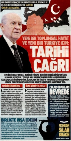 Bahçeli’nin yazısı bugün Türkgün gazetesinin manşetinden yayınlandı. MHP’nin bugün yayınlanacağını duyurduğu yazıda Bahçeli’nin hangi konulara değineceği merak konusuydu.