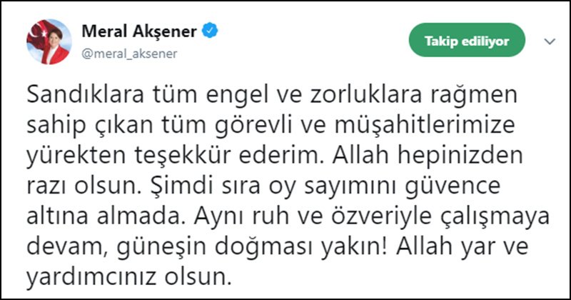 Oy kullanma işleminin sona ermesinin ardından Meral Akşener bir teşekkür mesajı yayınladı. Müşahitlere teşekkür eden Akşener “Şimdi sıra oy sayımını güvence altına almada.” dedi.
