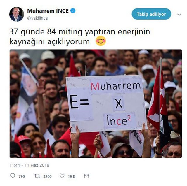 CHP’nin Cumhurbaşkanı adayı Muharrem İnce, sosyal medya hesabı üzerinden gülümseten bir paylaşımda bulundu. İnce, paylaşımında miting alanlarından bir fotoğraf paylaştı ve 37 günde 84 miting yapmasını sağlayan enerji kaynağını açıkladı.