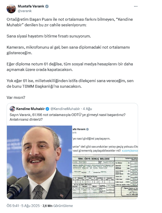 “Ortaöğretim Başarı Puanı ile not ortalaması farkını bilmeyen, “Kendine Muhabir” denilen bu zır cahile sesleniyorum: Sana siyasi hayatımı bitirme fırsatı sunuyorum. Kameranı, mikrofonunu al gel; ben sana diplomadaki not ortalamamı göstereceğim. Eğer diploma notum 61 değilse, tüm sosyal medya hesaplarını bir daha açmamak üzere orada kapatacaksın. Yok eğer 61 ise, milletvekilliğinden istifa dilekçemi sana vereceğim, sen de bunu TBMM Başkanlığı’na sunacaksın. Var mısın?”