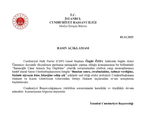Başsavcılıktan yapılan açıklamada “Cumhuriyet Halk Partisi (CHP) Genel Başkanı Özgür ÖZEL hakkında bugün ilimiz Ümraniye ilçesinde düzenlenen partisinin mitinginde yapmış olduğu konuşmasının bir bölümünde “İmamoğlu Çıkar Amaçlı Suç Örgütüne❞ yönelik soruşturmaları yürüten yargı mensuplarımızı hedef alarak Sayın Cumhurbaşkanımıza hitapla “Bundan sonra, etrafındakine, talimat verdiğine, bizimle uğraşan itine, köpeğine sahip çık” şeklinde sarf ettiği sözler nedeniyle Cumhurbaşkanına Hakaret ve Kamu Görevlisine Görevinden Dolayı Hakaret suçlarından re’sen soruşturma başlatılmıştır. Cumhuriyet Başsavcılığımızca yürütülen soruşturmalar kararlılık ve titizlilikle devam edecektir. Kamuoyunun bilgisine duyurulur.” ifadeleri kullanıldı.