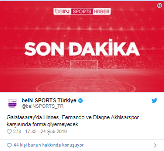 Spor Toto Süper Lig 23. haftasında Akhisarspor’u ağırlayacak olan Galatasaray’da Martin Linnes, Fernando ve Mbaye Diagne’nin forma giyemeceği açıklandı.