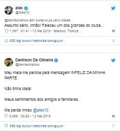 Bunun üzerine hatasının farkına varan Denilson paylaşımını sildi ve “Attığım mesajdan dolayı çok üzgünüm, gerçekten hiçbir fikrim yoktu. Tüm iyi dileklerim sevenleri ve ailesi ile. Seni de çok özledim Alex” dedi.