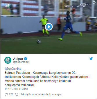 Türkiye Kupası’nda Batman Petrolspor ile Kasımpaşa arasında oynanan karşılaşmanın son dakikalarında skandal bir olay yaşandı. Koita’nın hastaneye kaldırıldığı olayın ardından hakemler maçı tatil etti. Olayla ilgili 1 kişi gözaltına alındı.