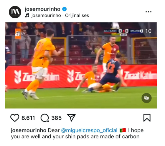 Fenerbahçe Teknik Direktörü Jose Mourinho, dün akşam oynanan Galatasaray-Başakşehir maçı ile ilgili bir paylaşım yaptı. Mourinho sosyal medya hesabından Başakşehir’in penaltı beklediği 25. dakikadaki Crespo – Abdülkerim pozisyonunu paylaştı.
