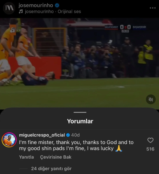 Miguel Crespo da Jose Mourinho’ya şu sözlerle yanıt verdi: “İyiyim efendim, teşekkür ederim. İyi dizliklerime (kaval koruyucularıma) şükürler olsun, iyiyim. Şanslıydım.”
