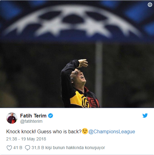 Şampiyon Galatasaray’ın teknik direktörü Fatih Terim, maç sonunda Şampiyonlar Ligi’nin resmi hesabını twitter’dan etiketleyerek (Tahmin edin kim geri döndü?) mesajını yolladı