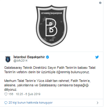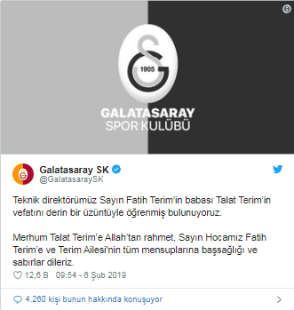 Sabah saatlerinde alınan acı haberin ardından Galatasaray’da Talat Terim’in yaşamını yitirdiğini duyurdu ve Fatih terim için başsağlığı mesajı yayınladı. Mesajda şu ifadeler yer aldı: “Teknik direktörümüz Sayın Fatih Terim’in babası Talat Terim’in vefatını derin bir üzüntüyle öğrenmiş bulunuyoruz. Merhum Talat Terim’e Allah’tan rahmet, Sayın Hocamız Fatih Terim’e ve Terim Ailesi’nin tüm mensuplarına başsağlığı ve sabırlar dileriz.”