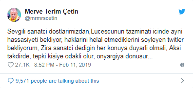Merve Terim Çetin paylaşımında “Sevgili sanatçı dostlarımızdan, Lucescu’nun tazminatı için de aynı hassasiyeti bekliyor, haklarını helal etmediklerini söyleyen twitler bekliyorum. Zira sanatçı dediğin her konuya duyarlı olmalı. Aksi takdirde, tepki kişiye odaklı olur” ifadelerini kullandı. Merve Terim’in paylaşımı yaklaşık 27 bin beğeni aldı.