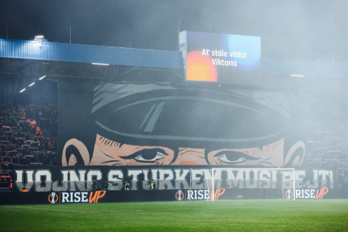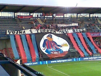 UEFA Avrupa Ligi’nde oynanan Viktoria Plzen-Fenerbahçe karşılaşmasına Çek taraftarların açtığı “Vojna s Turkem musi bejt” (Türklerle savaş olmalı) yazılı pankart damga vurdu.
