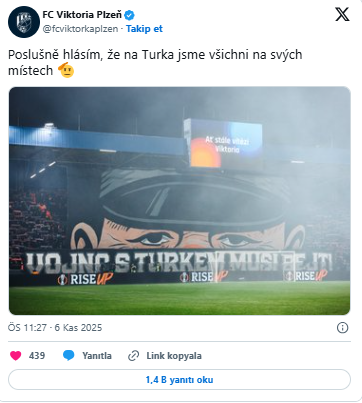 Söz konusu pankart, karşılaşmanın ardından Viktoria Plzen takımının sosyal medya hesabından “Saygıyla bildiririm ki, Türk karşısında hepimiz mevzilerimizdeyiz” ifadeleriyle paylaşıldı.