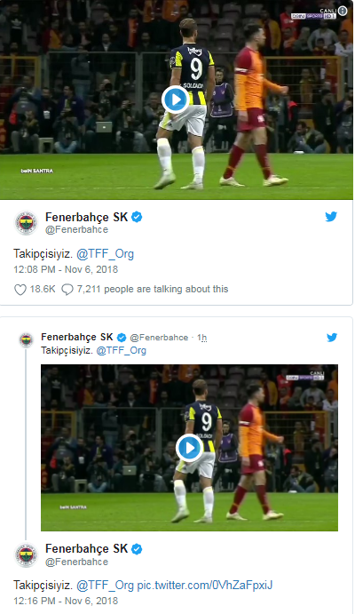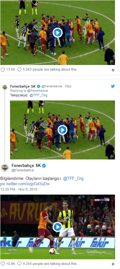 Spor Toto Süper Lig’in 11. haftasında oynanan Galatasaray – Fenerbahçe derbisinde yaşanan olaylarla ilgili sarı lacivertli kulüpten dikkat çeken paylaşımlar geldi. Sosyal medya hesaplarından paylaşılan videolarda olay anlarında yaşananlar ön plana çıkarılarak TFF’ye çağrıda bulunuldu.