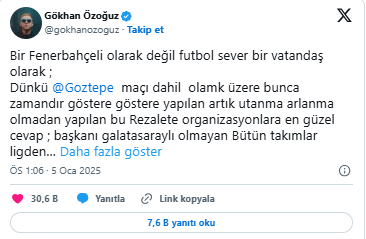 “Bir Fenerbahçeli olarak değil futbol sever bir vatandaş olarak; Dünkü Göztepe maçı dahil olmak üzere bunca zamandır göstere göstere yapılan artık utanma arlanma olmadan yapılan bu Rezalete organizasyonlara en güzel cevap; başkanı Galatasaraylı olmayan Bütün takımlar ligden çekilsin Galatasaray’ı kendi kendine oynasın şampiyon olsun. Futbolun inandırıcılığını , zevkini has rekabetin haklı sevincini, insanları kandıra kandıra satın ala ala bitirdiniz. Hepsi yapanlardan fitil fitil çıkacak.”
