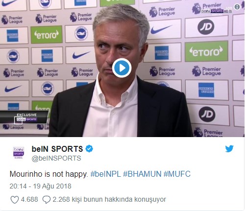 İngiltere Premier Lig’in ikinci haftasında Brighton’a deplasmanda 3-2 yenilen Manchester United, süpriz bir sonuca imza attı. Karşılaşmanın ardından kendisi ile röportaj yapan kadın muhabiri terleyen Manchester United Menajeri Jose Mourinho, bakışları ile sinirini belli etti. BeIN Sports muhabiri Carrie Brown’ın kendisine sorduğu soruları beğenmeyen Jose Mourinho, vücut dili ile kadın muhabiri tersledi.