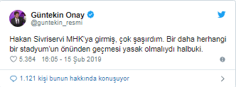 Güntekin Onay, yaptığı paylaşımda “Hakan Sivriselvi MHK’ye girmiş, çok şaşırdım. Bir daha herhangi bir stadyumun önünden geçmesi yasak olmalıydı halbuki” ifadelerini kullandı.